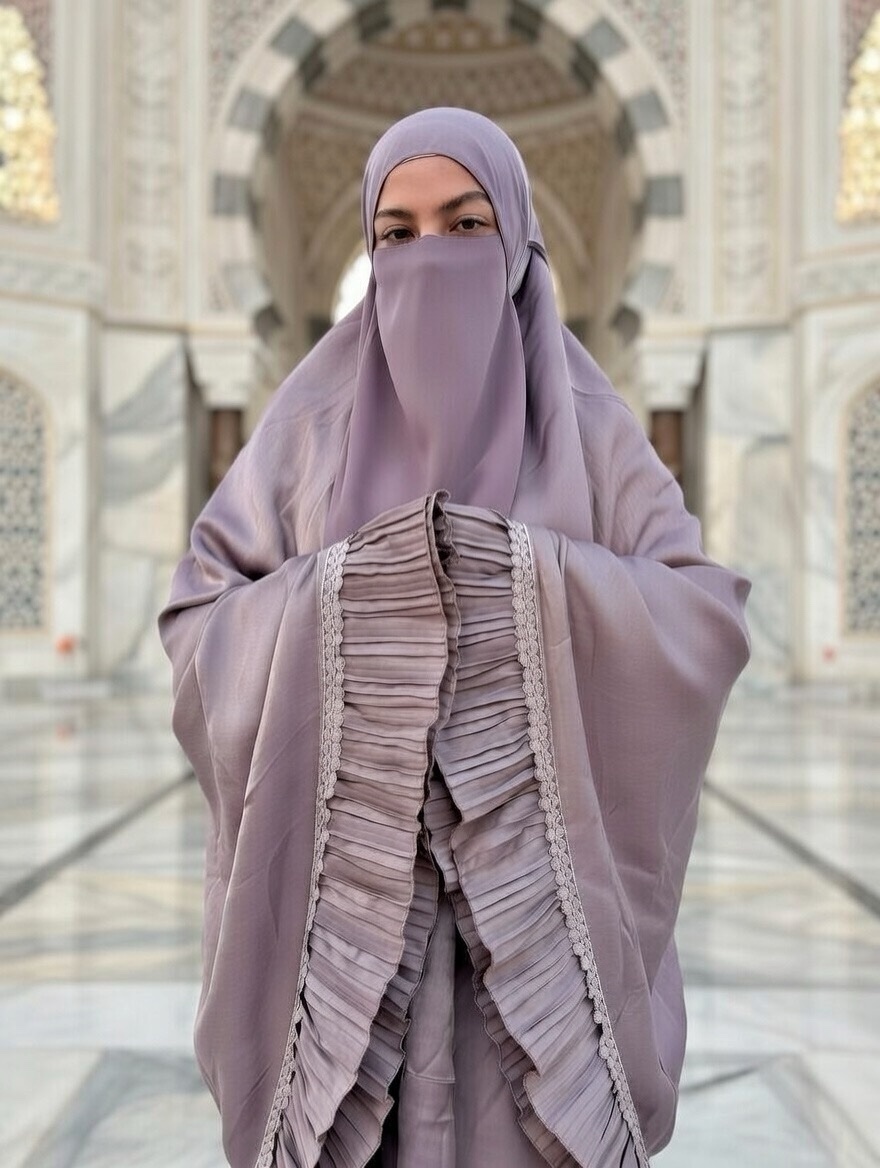 Le satin doux et lumineux assure un tombé élégant et une sensation soyeuse au porter. Chaque détail reflète un savoir-faire soigné, pensé pour proposer un ensemble de prière à la fois esthétique et durable.