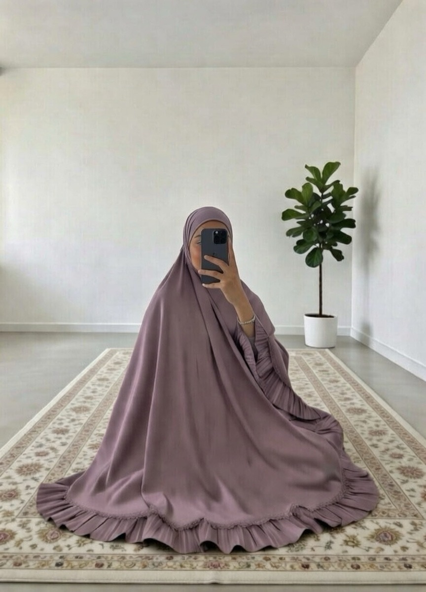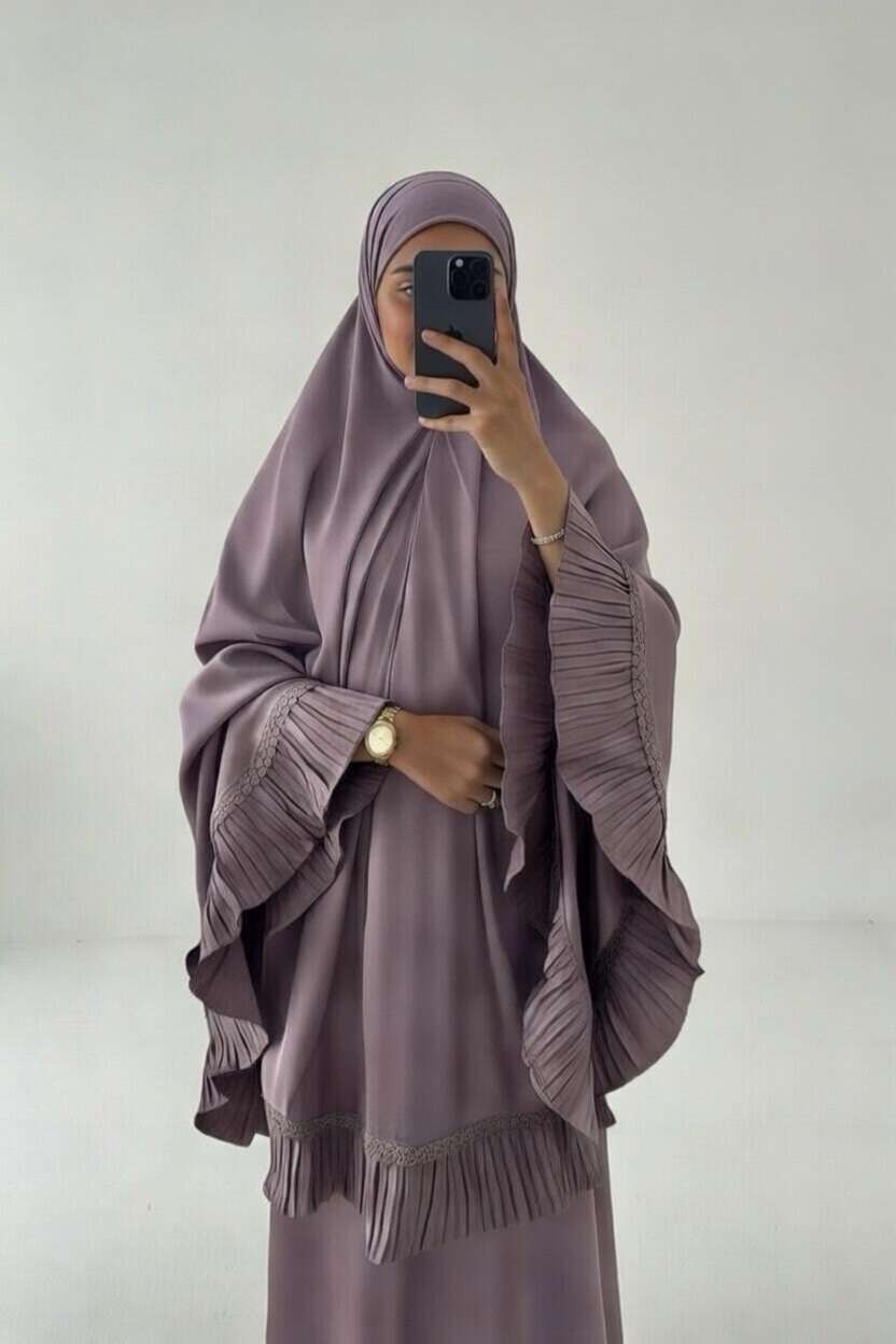 Découvrez Melaka, un ensemble de prière 2 pièces composé d’une jupe longue et d’une cape style khimar, confectionné en satin de très haute qualité. Inspirée du style malaisien et conçue en Malaisie, cette tenue de prière allie raffinement, fluidité et confort.